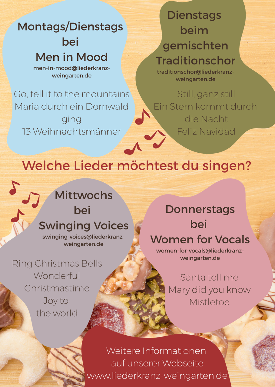 In den Chorproben werden jeweils drei weihnachtliche Lieder einstudiert, sowie als gemeinsames Stück von allen Chören „Ich gehe durch die weihnachtlichen Straßen“.