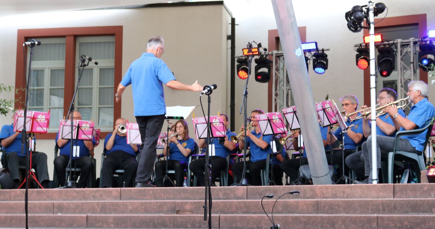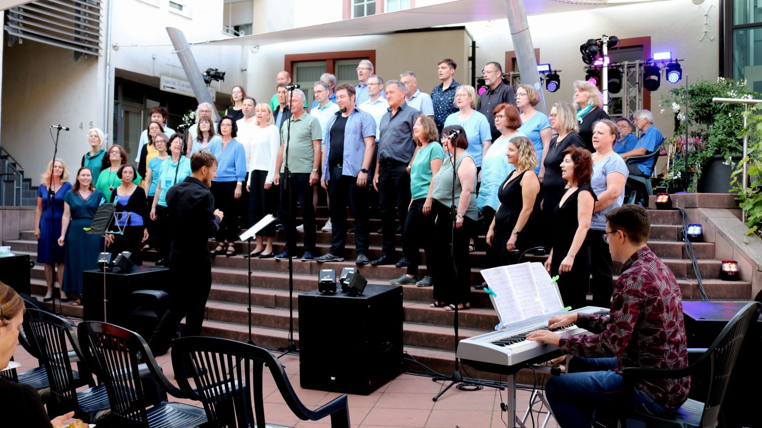 Zwei wundervolle Klangkörper - ein gemeinsames Ziel: Mit einem Open Air Konzert haben der Posaunenchor im CVJM und Swinging Voices im Gesangverein Liederkranz das 100. Jubiläum des Posaunenchores gefeiert und das Publikum auf dem voll besetzten Rathausplatz ging freudig mit.